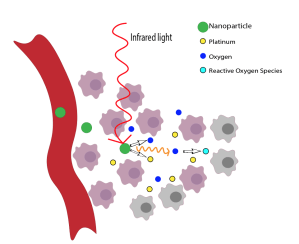 The first is the release of platinum (II), which is used to treat cancer right now in drugs like cisplatin, a common chemotherapy drug. When these particles interact with infrared light, the light converts the platinum (IV) to platinum (II), the cancer-killing kind. At the same time, the molecule holding the platinum to the upconversion nanoparticle, known simply as a linker, degrades to release oxygen into the tumor. This oxygen is necessary for the second main therapeutic action of these particles. While normal oxygen is not toxic, photosensitizing agents, like the upconversion nanoparticles, can transform wavelengths of light into energy that generates reactive oxygen species, which have cancer-killing properties. Using light to create reactive oxygen species is called photodynamic therapy.