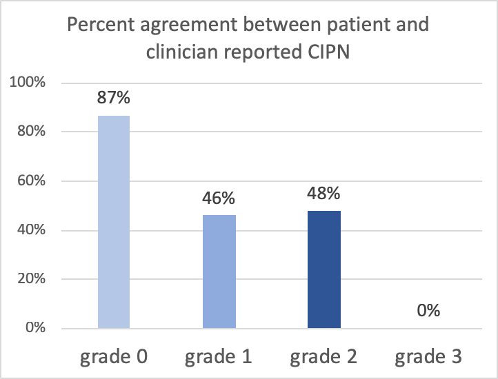 A recent study (Nyrop et. al. 2019) looked at how clinicians and patients reported numbness and tingling in the patient’s hands and feet (peripheral neuropathy) after getting chemotherapy for breast cancer. They call this chemotherapy induced peripheral neuropathy (CIPN). They found differences in reporting the severity of CIPN by patients compared to clinicians. They found the largest differences in reporting when symptoms of CIPN were most severe. This suggests that clinicians may be under-reporting the severity of CIPN when compared to patients reporting their own symptoms when CIPN is most severe. CIPN is a common and potentially debilitating, long lasting side effect of some chemotherapy treatments that can negatively affect a patient’s quality of life. This example supports the need for both patient and clinician reporting of side effects, especially in the case of CIPN.