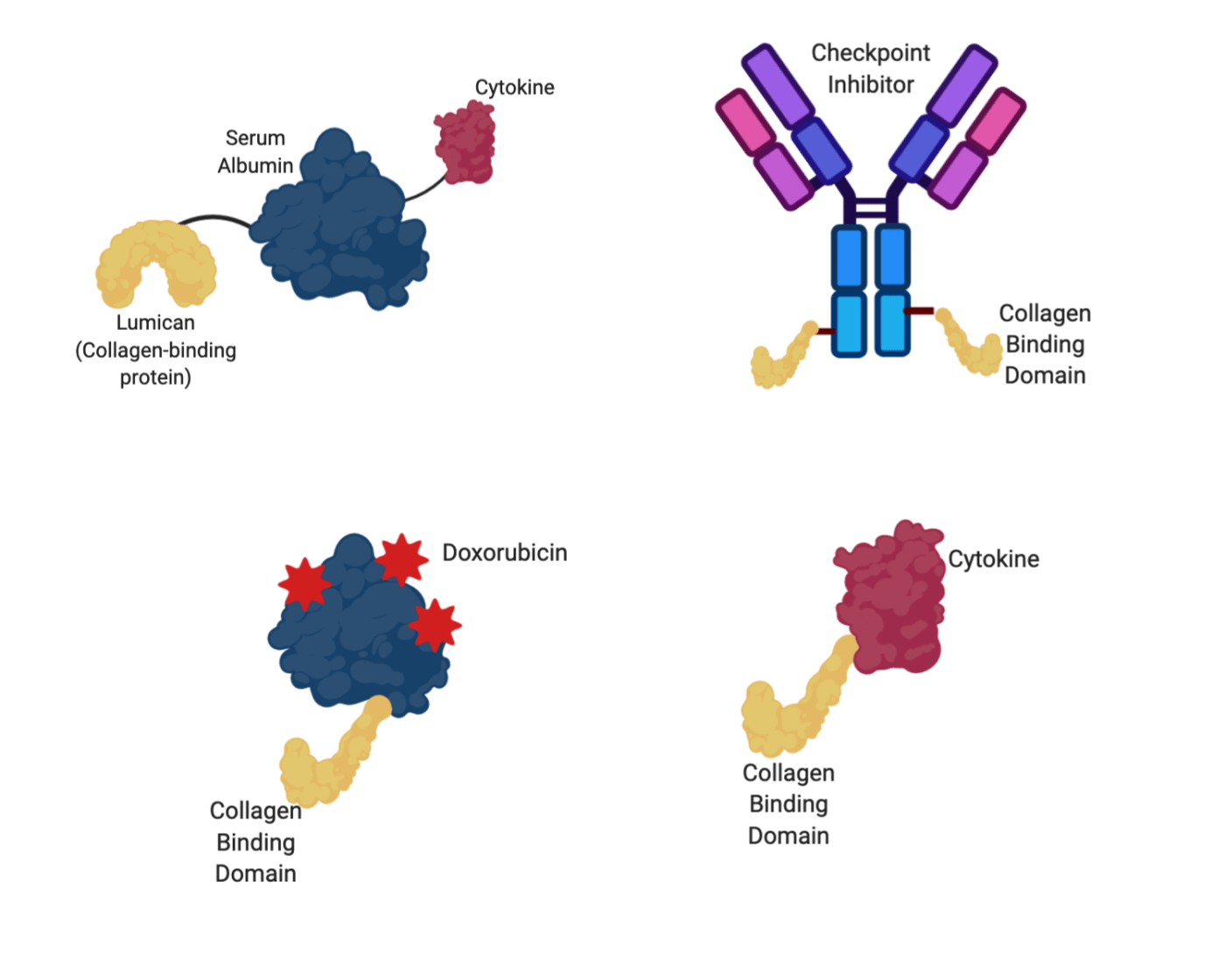Figure 3: Various collage-binding therapies used in these studies to treat cancer. Albumin, the carrier protein, is shown in blue. Therapeutic agents are shown in red (doxorubicin=bright red, cytokines=dark red), while collagen-binding domains are shown in yellow. Image created in BioRender by the author.