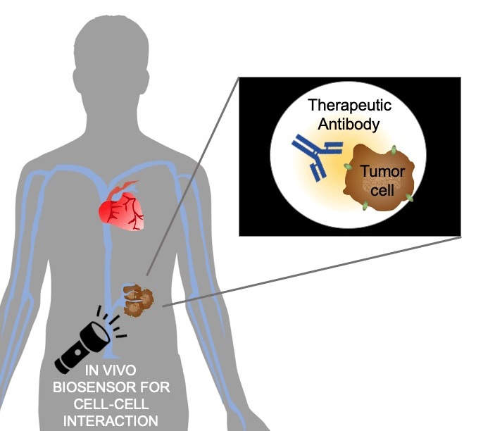 Attempts have been made to study mAb-target engagement in living animals. For example, mAbs are labeled with fluorophores – light tracers– before injecting into animals or human patients. It’s like assigning each of the solider a GPS tracker to see where they are at the battlefield. The distribution of mAbs in living animals/ patients is then visible by fluorescent imaging- shining a light on the tracers which then light up as well. However, this doesn’t necessarily mean we see how they fight. The signal that comes from the labeled mAbs in the animals could be actually away from the sites of action when the mAbs are not bound to the targets at all. Therefore a technology that directly shows the mAb-target engagement is highly desired.