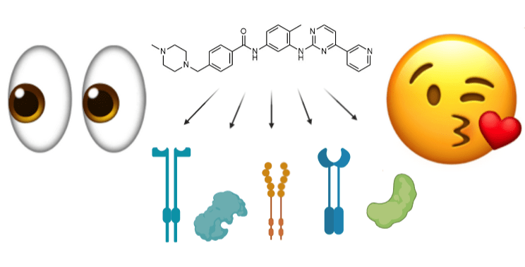Kinase inhibitors are a class of drugs that have exploded in FDA approval indications in cancer since the first kinase inhibitor imatinib was approved in 2001. While imatinib was originally designed as an inhibitor of the BCR-ABL kinase for use in chronic myeloid leukemia (CML), the activity of imatinib on off-target kinases allows it to have multiple uses. In addition to treating CML, imatinib is used to treat a variety of rare cancers including a type of skin cancer (DFSP) and an uncommon form of cancer in the GI tract (GIST). This ability of imatinib to treat wide ranging cancer types is directly due to its multi-target inhibition of the C-KIT, PDGFR-alpha, and BCR-ABL kinases (Figure 1).