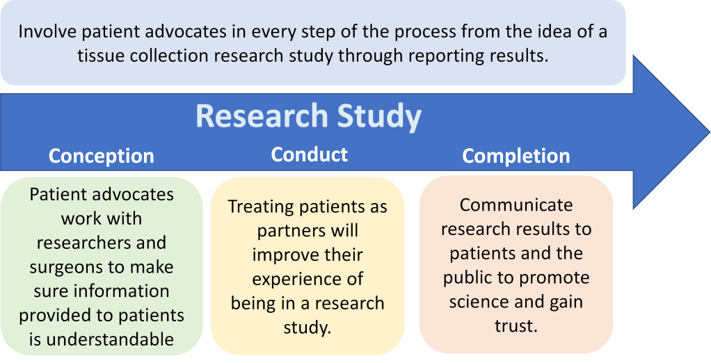 One way to increase access to tissue for research is to consider a patient-centered approach to tissue donation (Figure 2). A patient-centered tissue donation program could make sure researchers have access to tissues they need to do meaningful research. It will also make sure patients will be valued partners in the cancer research process. A patient-centered approach to tissue donation includes the involvement of patient advocates. Patient advocates can be involved in every step of the process from the idea (conception) of a research study through reporting results (conclusion). Patient advocates working with researchers and surgeons can make sure the information provided to patients is understandable, so they can make an informed decision. This includes the consent form as well as additional educational materials. Patient advocates can also help identify and minimize potential barriers to patient tissue donation. A patient-centered tissue donation program can improve the understanding of tissue donation which can increase a patient’s willingness to donate tissue and acceptance of multiple collections over time.