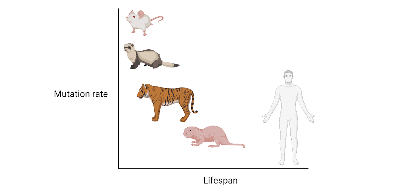 More recently, a study focusing on measuring mutation rates across mammals added another piece to Peto’s paradox puzzle. Mutation rate, or the frequency at which mutations occur in different cells, tissues, etc., is affected by both cell-intrinsic factors, such as flaws in the machinery that corrects errors in DNA replication during cell division, and extrinsic factors, such as environmental carcinogens like UV and cigarettes. Cagan et al. studied 16 mammalian species to capture differences in mutation rates in mammals and determine what characteristics, including what types of mutations, lifespan, and body size, might contribute to these differences.