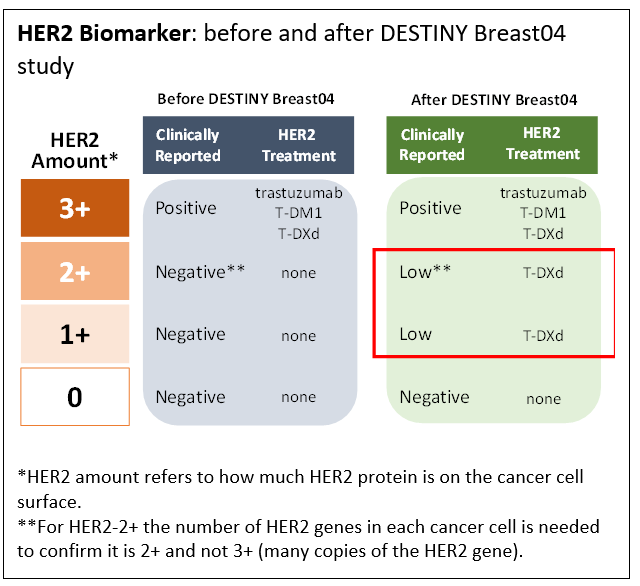 - Diagnostic HER2 testing needs to include a new HER2-Low category.