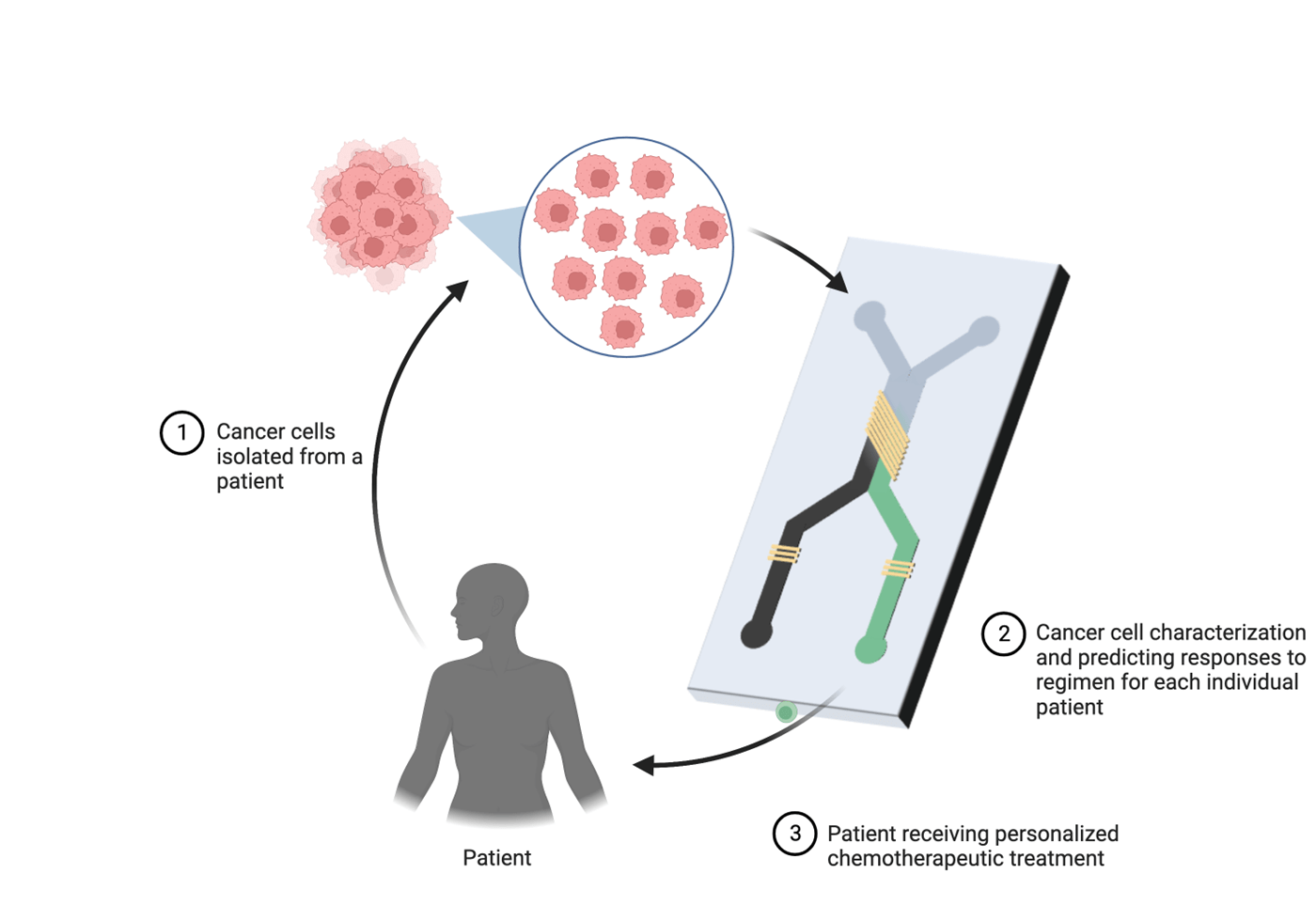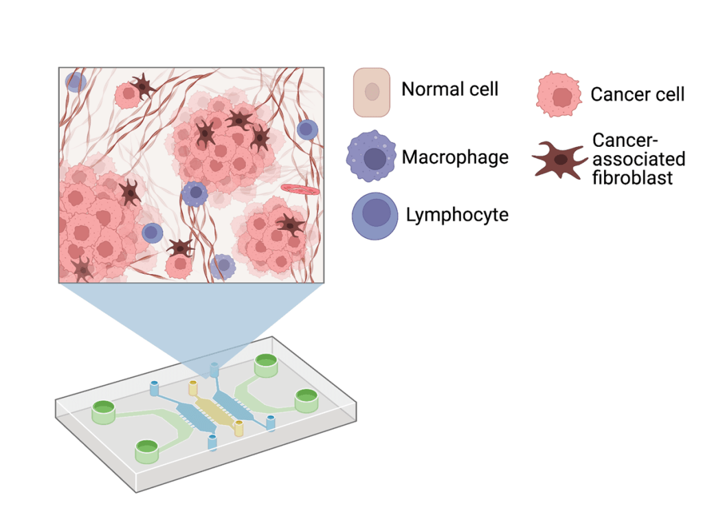 Microfluidics-based tumor-on-a-chip (TOC) systems provide a promising approach to address these challenges. Microfluidics is a branch of science and technology that manipulates and studies dynamic behavior of miniscule amounts of fluid in micrometer sized channels. These chips can house human cells along with their extracellular matrix (ECM) to exhibit organ-level functions and differentiation, which can be observed in real time (Figure 1). The ECM is crucial to cancer cell proliferation and is involved in cell adhesion, invasion, and migration to secondary sites. Since these chips can incorporate human tissues, they provide a platform that is biologically relevant without raising ethical dilemmas.