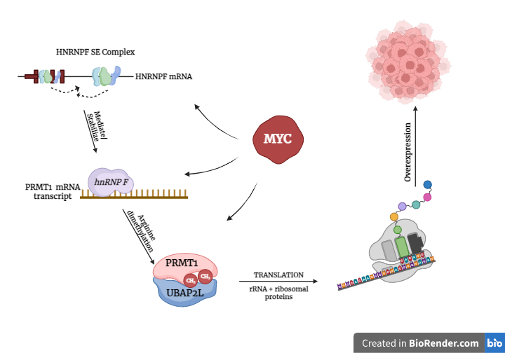 The Myc-coordinated network that is controlled by SE regulation, which helps the cancer cells by improving protein production through an increase in the generation of ribosomes. This chain of events involves a post-transcriptional agent called heterogeneous nuclear ribonucleoprotein F (hnRNP F), which plays a role in maintaining the stability of protein arginine methyltransferase 1 (Prmt1). Prmt1, in turn, modifies ubiquitin-associated protein 2-like (Ubap2l), an RNA-binding protein (RBP) directly involved in controlling translation (protein production), affecting its ability to bind to RNA molecules.