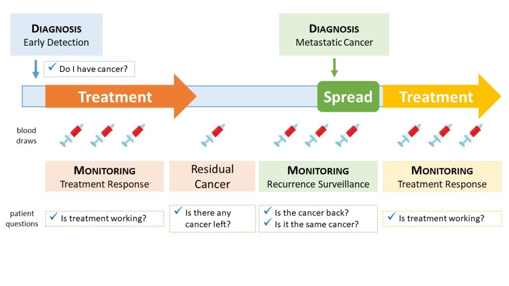 Early Cancer and Treatment: Looking for ctDNA when diagnosed will determine if ctDNA is present or not before treatment begins. Then seeing what happens to it during and after treatment has the potential to change cancer care. “Is it all gone? Has it increased or decreased? Do I need more treatment?”