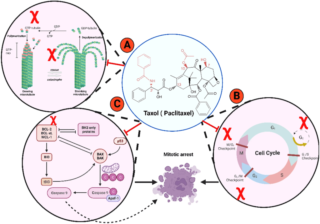 Taxol (Paclitaxel) mechanism of action in cancer. (2024). Cancer Cell International, 24(1), Article 280. https://cancerci.biomedcentral.com/articles/10.1186/s12935-024-03415-0/figures/2
