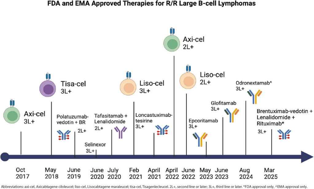 Previously, over 80% of patients failed to respond sufficiently to second-line chemotherapy or were ineligible to receive autologous stem cell transplant (auto-SCT). Within the last 10 years, the treatment for patients with DLBCL went from platinum-based therapies to the development of CAR-T therapy and other targeted and combination treatment options. Despite these advancements, there is no clear evidence on sequencing and optimal treatment selection, and the majority of patients relapse within 6 months of initiation.