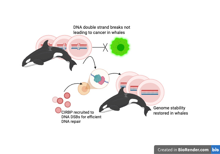 Image 2: CIRBP (cold-induced RNA-binding protein) excels at repairing broken DNA, a strategy that whales utilize for genome stability, cancer prevention and longevity. [Created in https://BioRender.com]