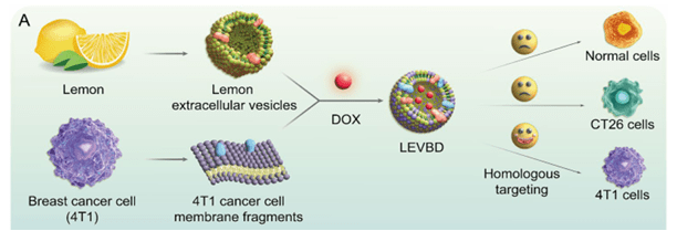 The hybrid vesicles were loaded with doxorubicin (DOX), a commonly used anti-cancer drug. The final composite nanodrug delivery vector, called LEVBD (lemon-derived vesicle, breast cancer cell membrane, and doxorubicin), is designed to circulate in the bloodstream, target 4T1 tumors, attach to them, and then release the drug directly into the cancer tissues.