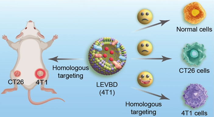 Then the most convincing evidence came from experiments using mice, as shown in Figure 2. LEVBD were injected into mice with 4T1 breast tumors, and fluorescent markers were used to track the particles. They found that the hybrid vesicles accumulated mainly in tumors rather than in other organs such as the liver, kidney, or spleen. To further test specificity, they used mice that carried two different types of tumors: one with 4T1 breast cancer cells and the other with CT26 colon cancer cells. The vesicles were mainly concentrated in the 4T1 tumor cells, indicating homologous targeting.